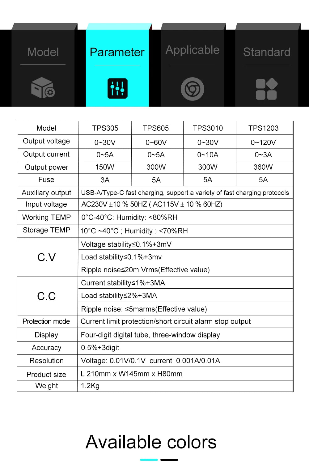 利用我们的 30V 10A 实验室可调直流电源系列,具有四种多功能型号: TPS305, TPS3010, TPS605, 和 TPS1203. 这些微型开关直流电源专为精确、可靠和易用而设计,在紧凑轻巧的设计中提供高功率密度。无论您参与生产线测试、电子产品维修、产品老化、电池充电还是实验室研究,此电源系列都能提供您所需的灵活性和性能。