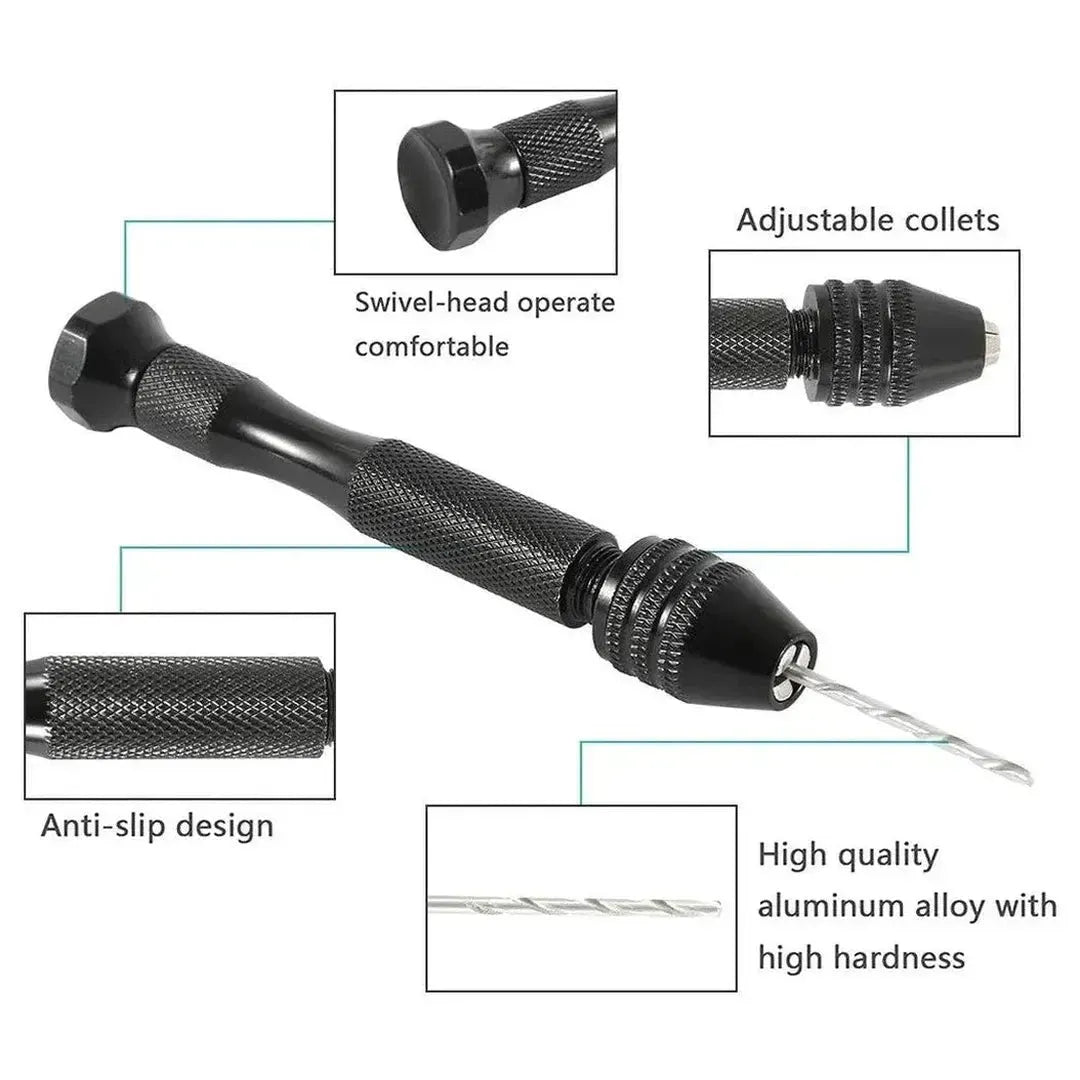 手钻配有可调节的钻头支架,可容纳各种钻头尺寸,确保完美满足您的特定需求。非常适合模型、珠宝、珠子、塑料、电线和其他需要精确钻孔的 DIY 项目。