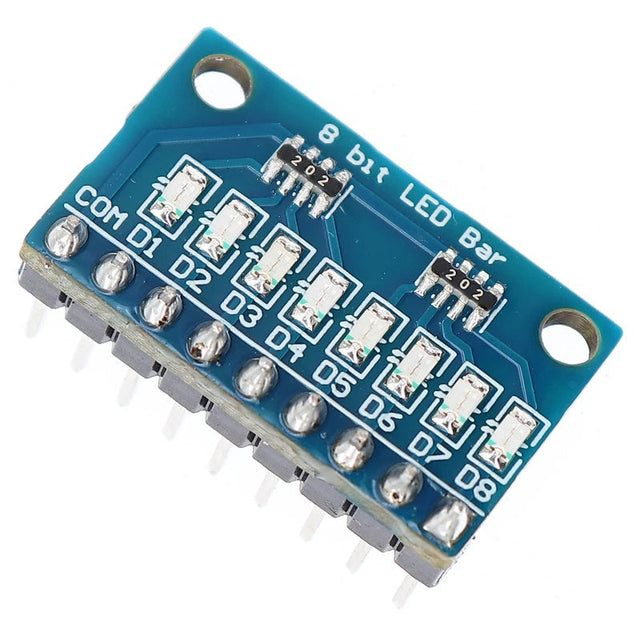 This 8-bit LED bar graph module features eight red LEDs in a common cathode configuration, designed for clear visual indication in electronic projects. Each LED can be controlled independently, making the module suitable for displaying levels, status indicators, and simple visual effects.